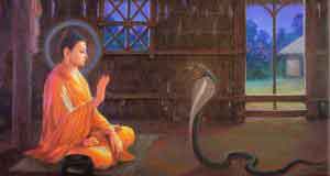 Đức Phật bằng lòng giúp nhà vua, nên một hôm, Ngài một mình một thân đi bộ thẳng vào khu rừng trúc, nơi con rắn độc đang ẩn náu. Con rắn độc nhìn thấy đức Phật từ xa, tâm sân hận nổi lên, nó đăm đăm nhìn đức Phật rồi còn há miệng thật to, thè cái lưỡi đỏ ra tính vồ tới làm hại Ngài. Đức Phật vận dụng lực từ bi, từ mỗi đầu ngón tay của Ngài phát ra năm tia sáng năm màu. Những tia sáng năm màu rực rỡ này chiếu lên thân rắn khiến nó lập tức trở nên hiền lành, độc khí tiêu tan, tâm hoan hỉ phát sinh. Nó ngóc đầu lên chiêm ngưỡng đức Phật và suy nghĩ trong đầu rằng: