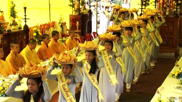 Câu 1. Vào ngày rằm tháng Bảy mỗi năm, Phật tử khắp nơi câu hội nhân ngày chư Tăng Tự Tứ hoan hỷ, sắm sanh pháp phục lòng nguyện cúng dâng chiếc y… vàng. Đầu nâng y, ba vòng đi nhiễu thẳng hàng. Chờ chư Tăng người thi ân chú nguyện, nhận y vàng khai sáng đạo tràng tâm – Chiếc Ca Sa mảnh ruộng phước thậm thâm, là phước lợi người gieo trồng tịnh đức. Nhân thiên hân hoan đón mừng đại lễ. Phút giây an lạc cõi lòng thánh thiện.