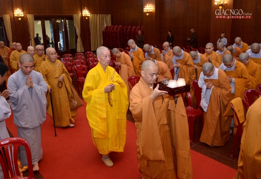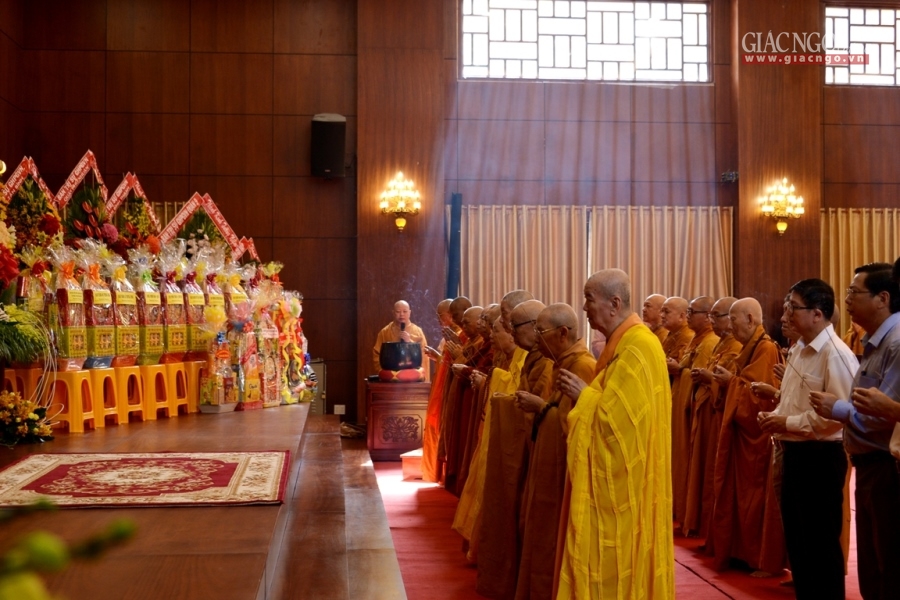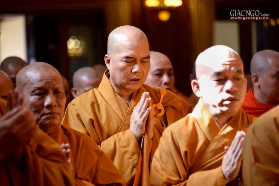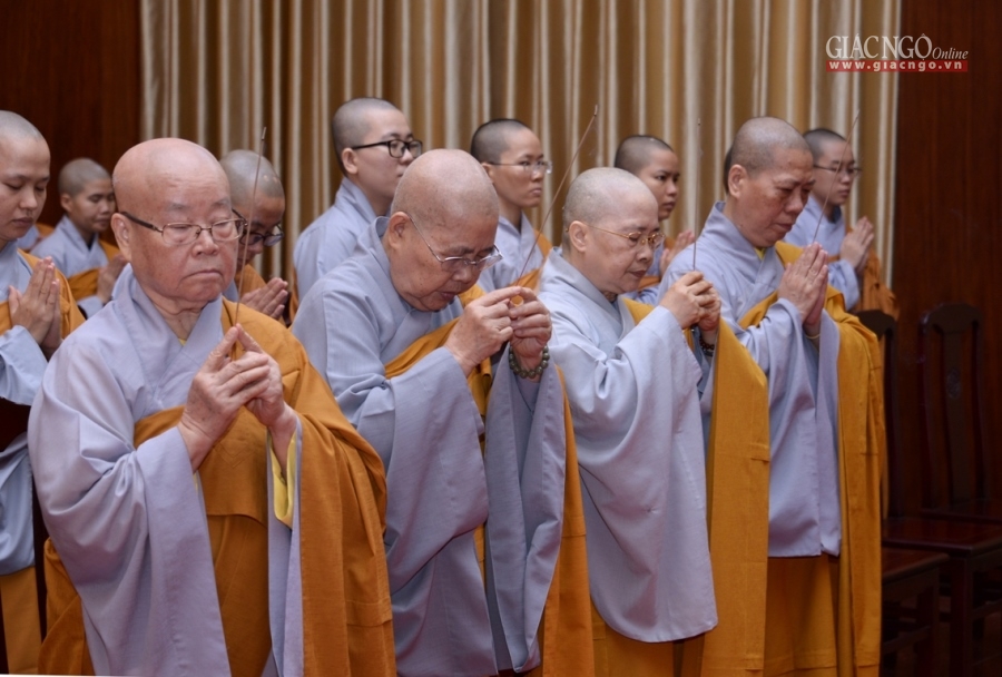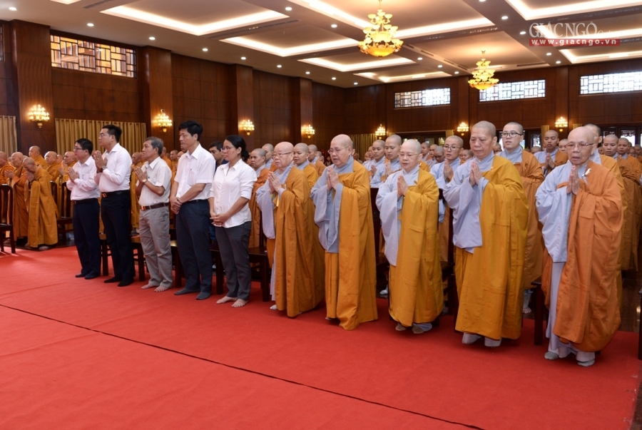 Đại chúng cung kính chí thành, nhất tâm tụng niệm khóa lễ Bát-nhã Tâm kinh cúng dường, đồng thành kính đảnh lễ, tưởng niệm đến Giác linh cố Đại lão Hòa thượng cùng chư vị tiền bối hữu công, các bậc cao Tăng thạc đức đã đóng góp to lớn trong công cuộc chấn hưng Phật giáo Việt Nam, một đời cống hiến, phụng sự cho Đạo pháp và Dân tộc.